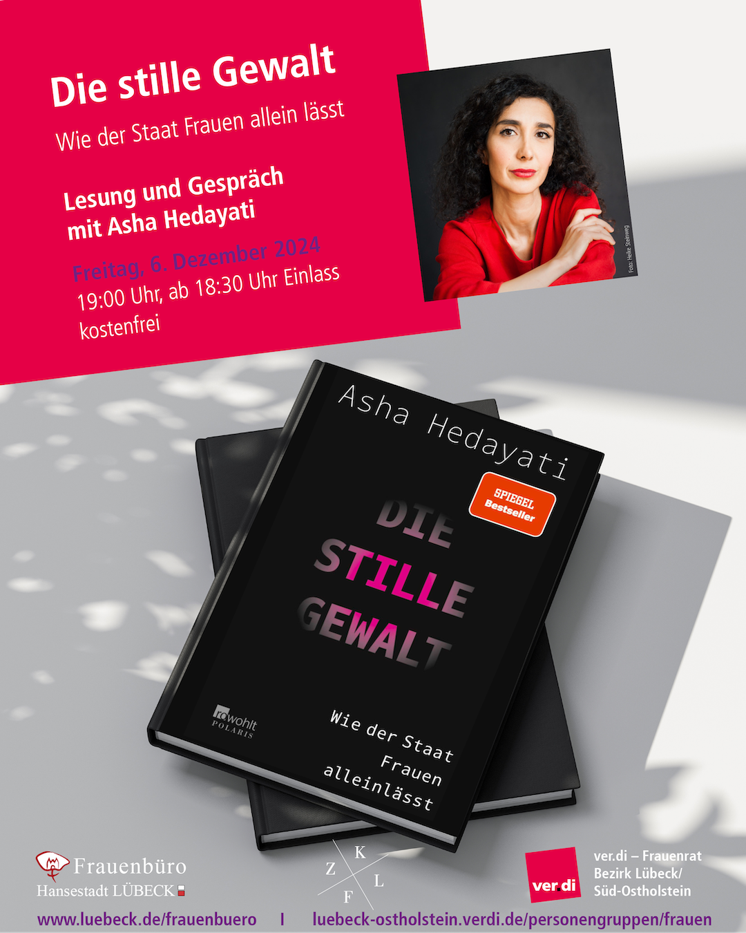 Anlässlich des Internationalen Tags zur Beseitigung von Gewalt gegen Frauen laden das Frauenbüro, ver.di – Frauenrat Bezirk Lübeck / Süd-Ostholstein und das Zentrum für Kulturwissenschaftliche Forschung Lübeck zur Lesung mit anschließendem Gespräch am Freitag, 6. Dezember 2024, um 19 Uhr (Einlass ab 18.30 Uhr) ein. Die Lesung findet im Zentrum für Kulturwissenschaftliche Forschung (ZKFL), Königstraße 42, 23552 Lübeck, statt.