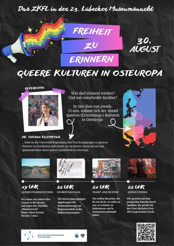Was darf erinnert werden – und wer entscheidet darüber? Diese Fragen stehen im Zentrum der diesjährigen Museumsnacht am ZKFL. Unter dem Motto „Freiheit zu erinnern“ widmen wir uns queeren (Erinnerungs-) Kulturen in Osteuropa. Warum sprechen wir so selten über Osteuropa in diesem Zusammenhang? Erinnern ist ein aktiver, widerständiger Prozess. Das Recht, sich zu erinnern, braucht Sichtbarkeit und Engagement und verlangt Freiheit!